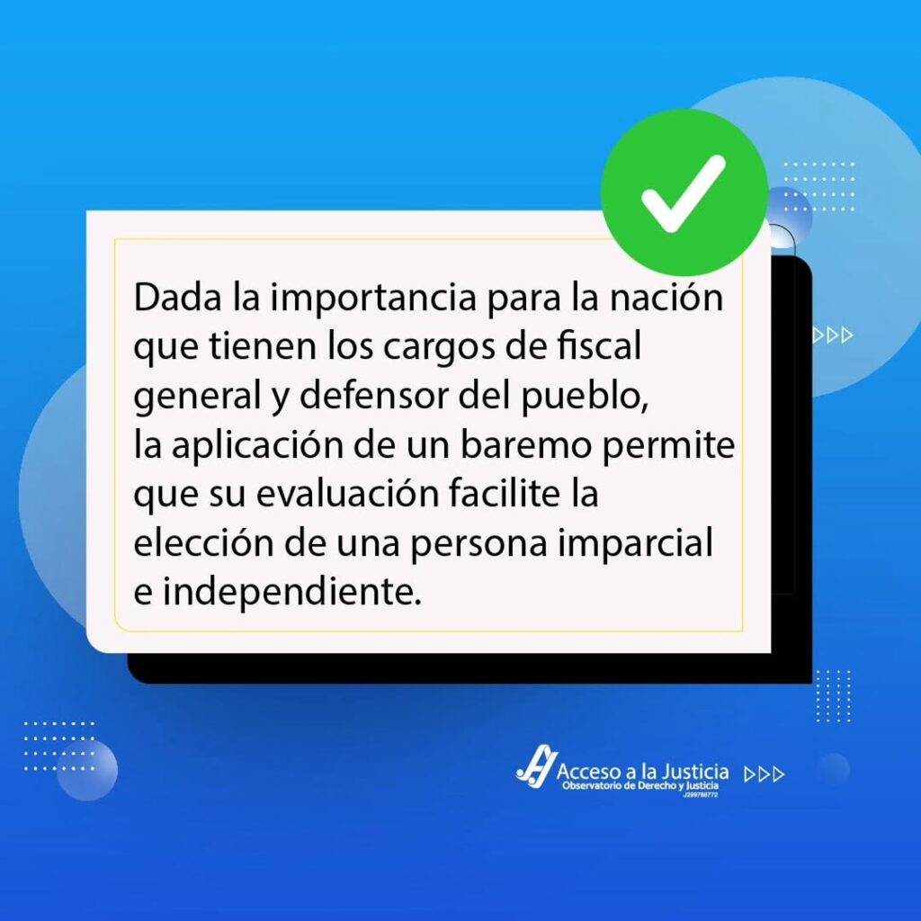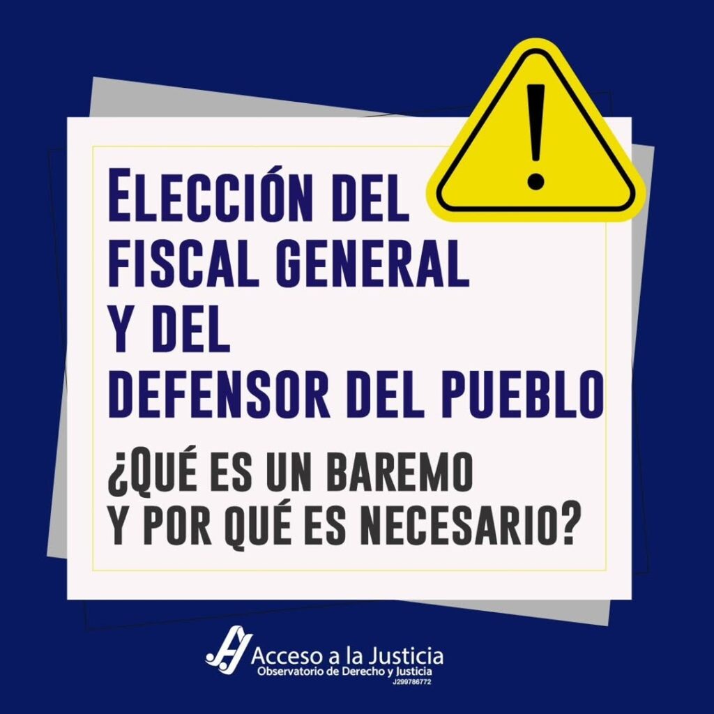 La ONG Acceso a la Justicia instó a las autoridades a publicar los criterios que se utilizan para evaluar a los aspirantes a fiscal general y defensor del pueblo, en medio del proceso de selección que desarrolla la Asamblea Nacional de Venezuela.La organización explicó que el baremo, instrumento que define los parámetros de evaluación, es fundamental para medir de forma objetiva la preparación, experiencia y trayectoria de los candidatos. A su juicio, su divulgación permitiría garantizar que las designaciones respondan al mérito y no a decisiones discrecionales.