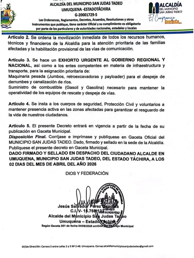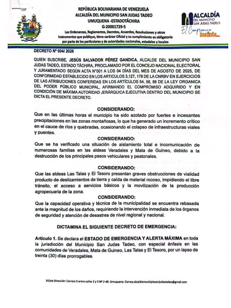 La crisis climática en el estado Táchira ha escalado a niveles críticos. Tras los graves daños registrados en la Troncal 001 y el aislamiento de diversas comunidades, el alcalde del municipio San Judas Tadeo, Jesús Salvador Pérez Gandica, ha promulgado el Decreto N° 004/2026, declarando oficialmente el Estado de Emergencia y Alerta Máxima en toda la jurisdicción.