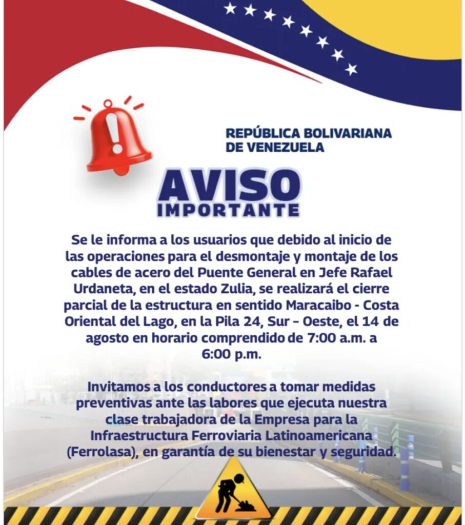 “Se realizará el cierre parcial de la estructura en sentido Maracaibo – Costa Oriental del Lago, en la Pila 24, Sur – Oeste, el 14 de agosto en horario comprendido de 7:00 a.m. a 6:00 p.m.”, detalla el escrito.