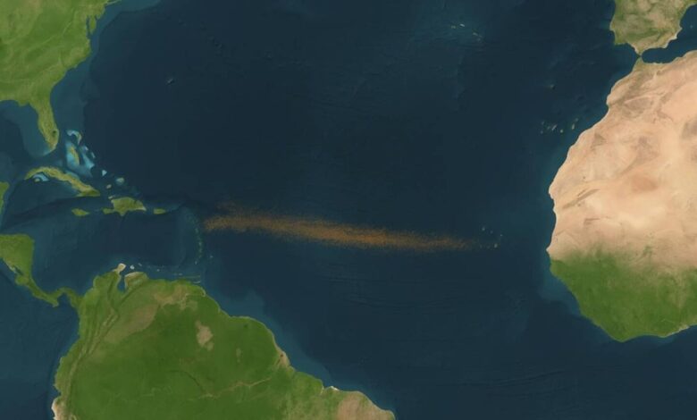 La gran mancha marrón que aparece en imágenes satelitales del Atlántico tropical y traza una banda entre la costa occidental de África y el Caribe no es un vertido de petróleo ni un episodio aislado.