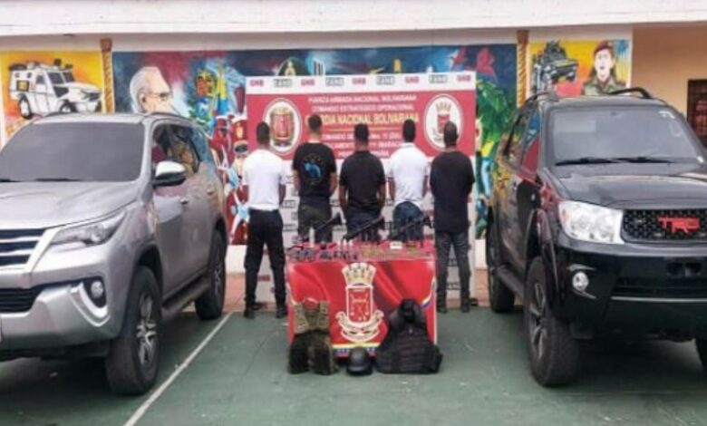 Estas personas fueron detenidas el viernes pasado por efectivos militares en la avenida Milagro Norte, sector San Martin municipio Maracaibo (Zul), según reporte obtenido en predios castrenses. Los sujetos se desplazaban en dos vehículos blindados marca Toyota, modelo Fortuner, placas AH186SV y AL707BA.
