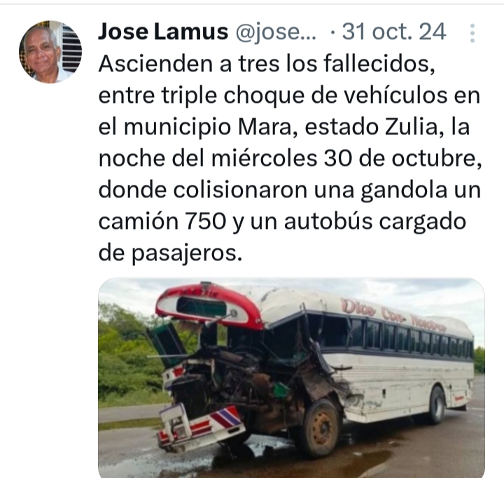 Tres personas perdieron la vida tras el aparatoso accidente de tránsito, registrado la noche de este miércoles 30 de octubre en el sector La Tigra, carretera Troncal del Caribe, municipio Mara, así lo informó el periodista José Lamus en un mensaje publicado a través de sus redes sociales.El choque ocurrió sobre las 8:30 p.m. entre un camión tipo 350 color verde y un autobús de color blanco perteneciente a la línea Guana, que cubre la ruta Maracaibo-Paraguaipoa (Los Filúos).