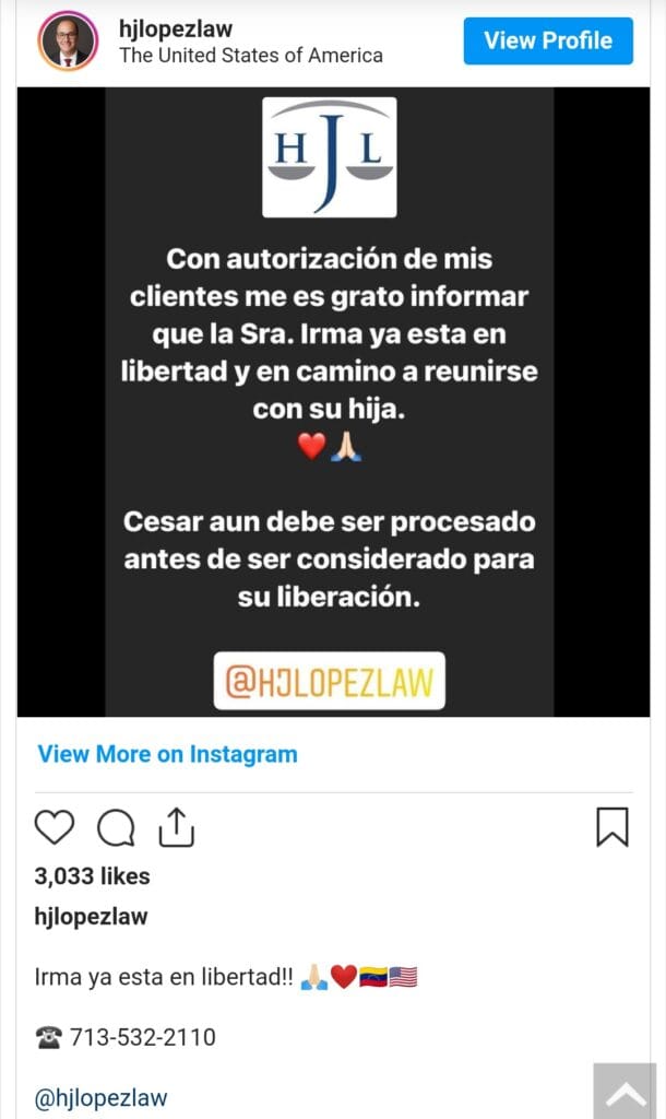 Héctor López, abogado especialista en migración, quien lleva el caso de Irma, aseguró en su cuenta de Instagram que “Irma ya está en libertad y en camino a reunirse con su hija”.