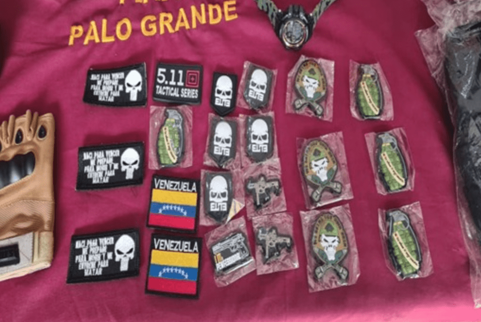 A estas mujeres se les incautó 6 camisas tácticas, 9 pantalones tácticos, 3 portafusiles, 2 correas tácticas, una pistolera plástica, 7 pares de botas tácticas, un par de rodilleras tácticas, un par de coderas, 2 relojes tácticos camuflados, 25 emblemas plásticos y de tela alusivos a calaveras, bandera de Venezuela y armas, 3 equipos telefónicos y 3 gorras tácticas.