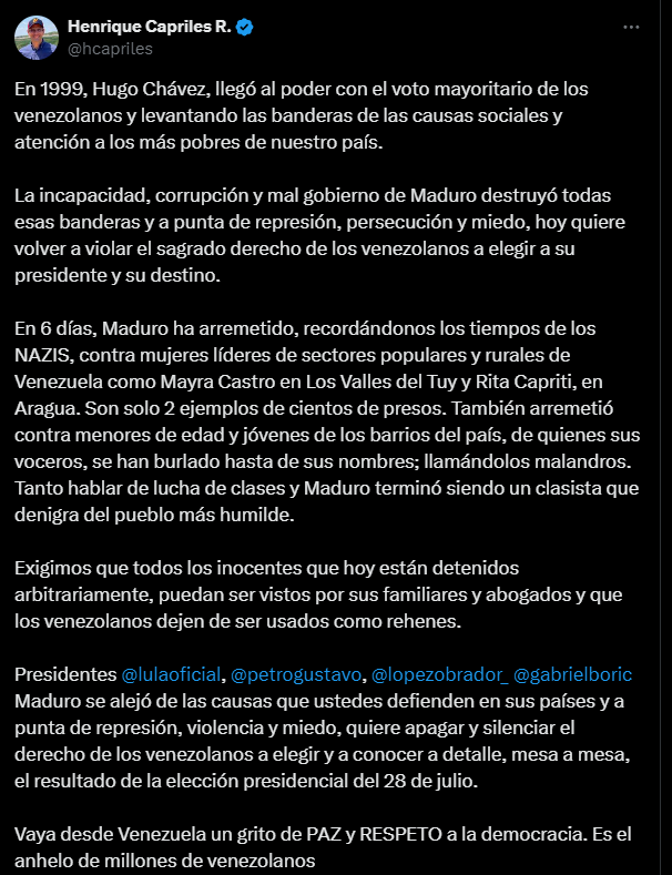 El opositor Henrique Capriles afirmó este sábado que el presidente Nicolás Maduro pretende silenciar el derecho de los venezolanos a elegir y conocer los resultados detallados de las elecciones presidenciales del domingo pasado «a punta de represión violencia y miedo».A través de una publicación en X, el exgobernador les escribió a los presidentes Luiz Inácio Lula da Silva (Brasil), Gustavo Petro (Colombia), Andrés Manuel López Obrador (México) y Gabriel Boric (Chile) que Maduro «se alejó de las causas» que defienden en cada uno de sus países.