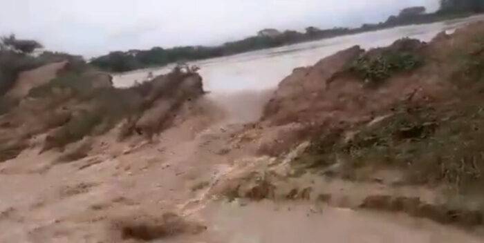 A la altura del Kilómetro 43 de la vía El Guayabo/Encontrados Municipio Catatumbo. La crecida del río Zulia rompió parte del dique que protege fincas y poblaciones cercanas.