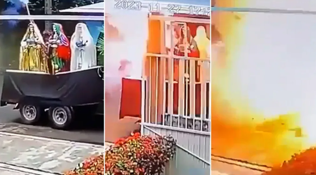 Cámaras de seguridad grabaron el momento exacto en el que un carro alegórico en la celebración de la Santa Muerte terminó en llamas en el municipio de Catemaco, en Veracruz, México, luego de que se registrara una explosión que dejó a dos personas lesionadas de gravedad.