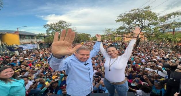 El candidato presidencial de la oposición, Edmundo González Urrutia, y la líder de Vente Venezuela, María Corina Machado, en su recorrido por Venezuela, llegaron este viernes a Guatire, estado Miranda, para llevar el mensaje con miras a las elecciones presidenciales del próximo 28 de julio.