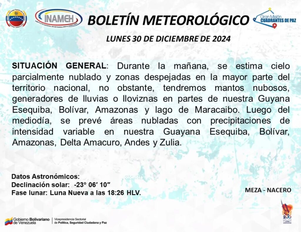 El Instituto Nacional de Meteorología e Hidrología (Inameh), estima para este lunes 30 de diciembre cielo parcialmente nublado y zonas despejadas en gran parte del territorio nacional, no obstante se prevé mantos nubosos generadores de lluvias en Guayana Esequiba, Bolívar, Amazonas y lago de Maracaibo.