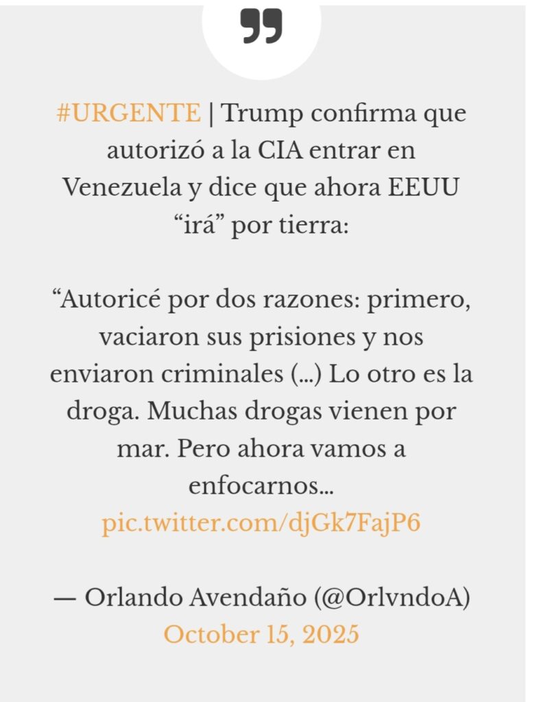 Aunque aún no está claro si la CIA ya ha comenzado a ejecutar estas operaciones, la autorización de Trump llega en un momento de creciente presencia militar estadounidense en la región, con más de 10.000 soldados desplegados, junto a varios buques de guerra y un submarino.