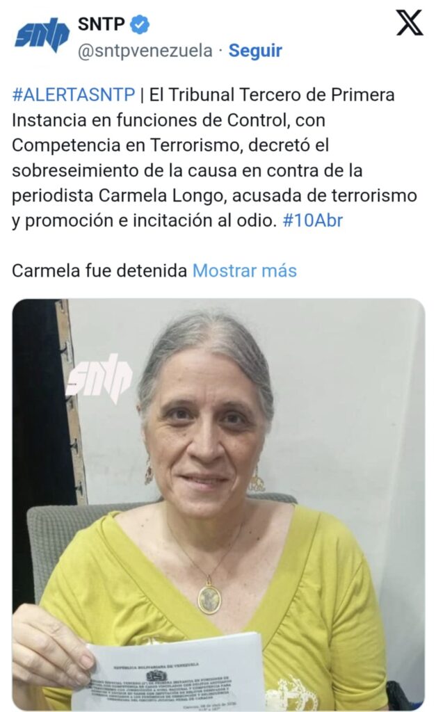 El Sindicato Nacional de Trabajadores de la Prensa (Sntp) informó este viernes 10 de abril sobre la liberación plena de la periodista Carmela Longo a través de una amnistía.