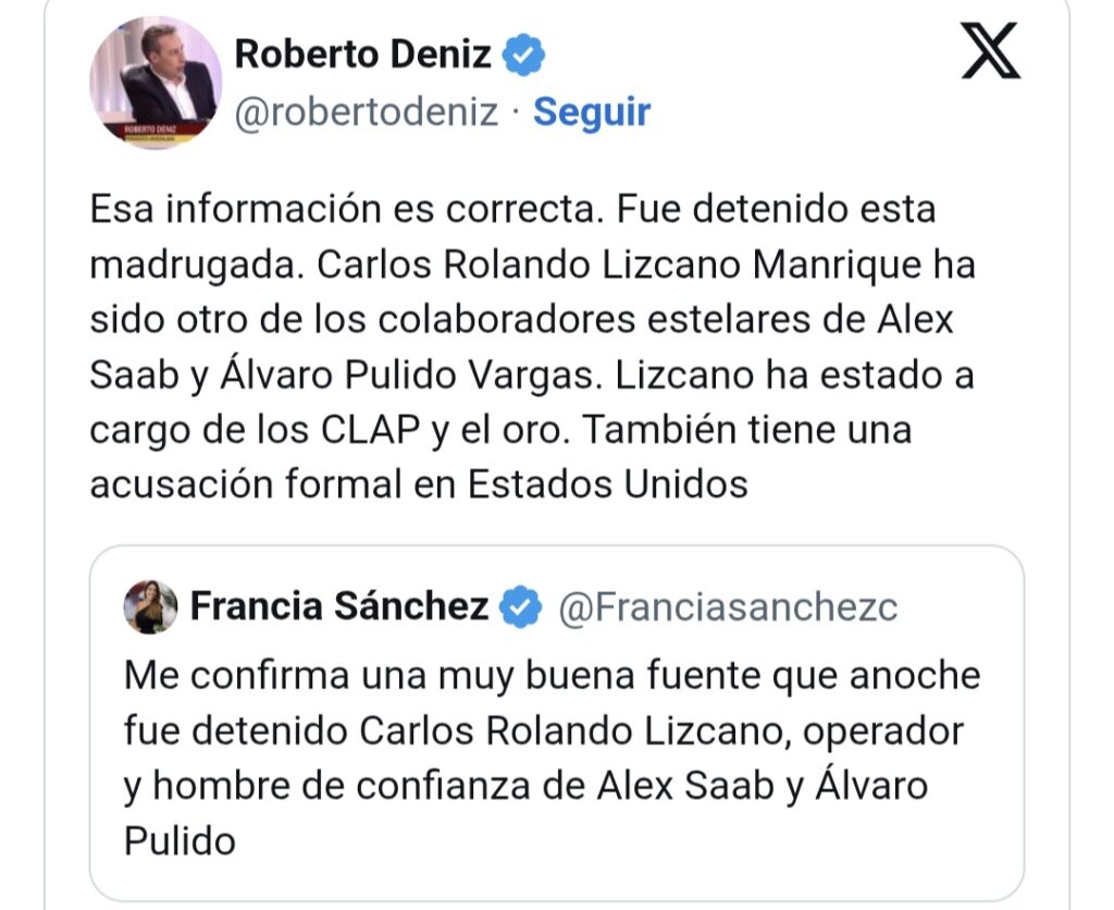 El periodista de investigación Roberto Deniz confirmó la presunta detención de Carlos Rolando Lizcano, identificado como un colaborador cercano y operador clave del empresario colombiano Alex Saab, así como de su socio Álvaro Pulido.