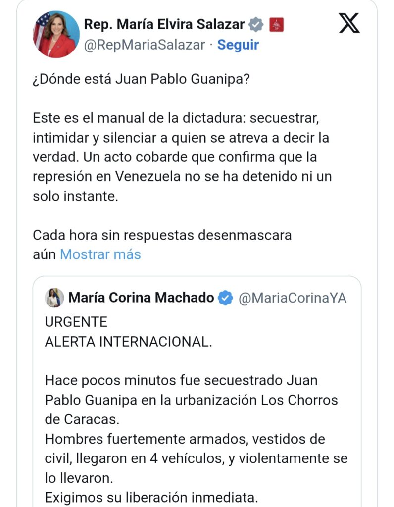 La republicana en su mensaje responsabilizando al régimen y dijo que “el régimen debe responder por la integridad de Juan Pablo Guanipa y liberarlo de inmediato. Si algo le sucede, habrá consecuencias muy graves. Estados Unidos está pendiente”.