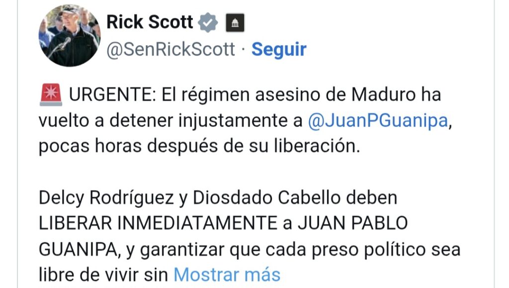 Por otro lado, el senador Rick Scott señaló que “el régimen asesino de Maduro”, “Delcy Rodríguez, Diosdado Cabello deben liberar inmediatamente a Juan Pablo Guanipa, y garantizar que cada preso político sea libre de vivir sin opresión” y sentenció al igual que su colega Salazar que “Estados Unidos está observando”.