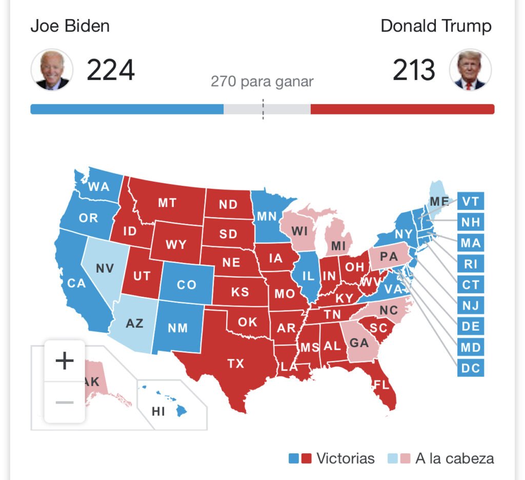 No obstante, Joe Biden lidera momentáneamente en el conteo de votos electorales (238 frente a los 213 de Trump), según proyecciones de Fox News. De acuerdo con proyecciones de AP, Biden lidera con 236 votos electorales frente a los 213 de Trump.
