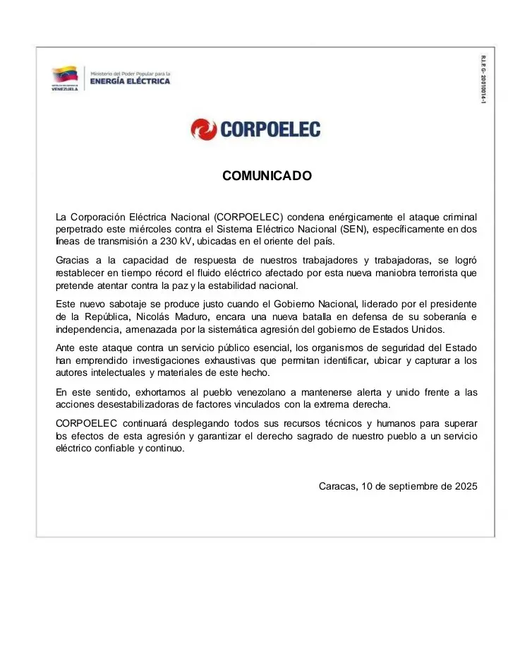 Según Corpoelec, este intento de “sabotaje” se produce justo cuando la administración de Nicolás Maduro “encara una nueva batalla en defensa de su soberanía e independencia”, en referencia a la presencia naval de Estados Unidos en el mar Caribe, que, de acuerdo con Washington, busca combatir a los cárteles de droga latinoamericanos.