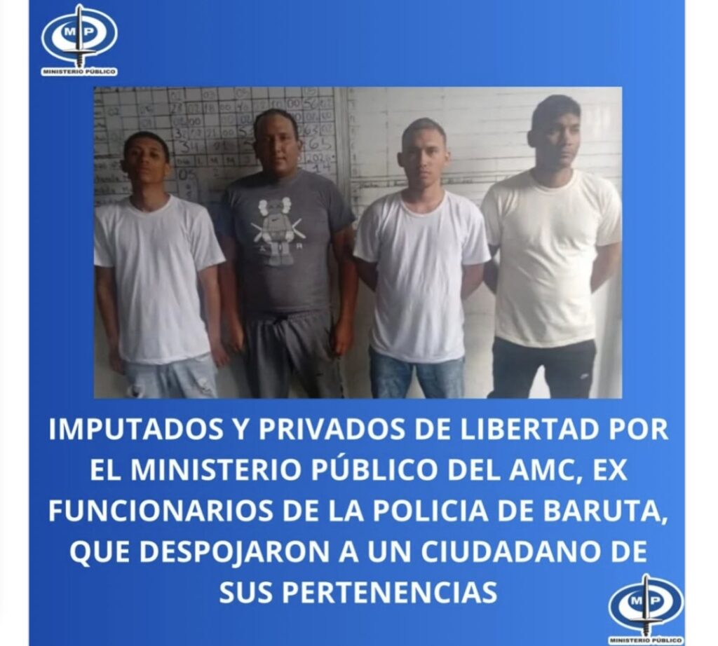 El Ministerio Público informó que fueron imputados y privados de libertad cuatro exfuncionarios de la Policía de Baruta, señalados por despojar a un ciudadano de sus pertenencias y además exigir una alta suma de dinero a cambio de su libertad.