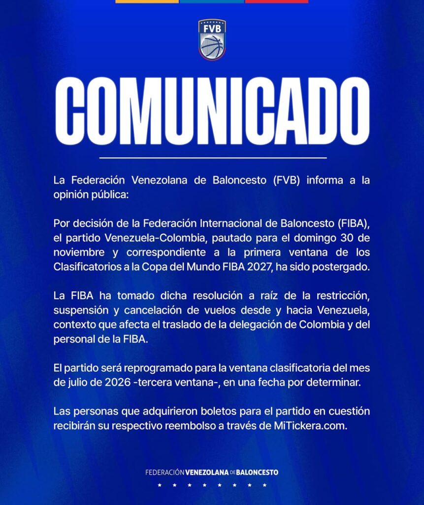 La Federación Internacional de Baloncesto (FIBA) anunció este viernes 28 de noviembre el aplazamiento del partido entre Venezuela y Colombia, correspondiente a los Clasificatorios de las Américas rumbo a la Copa del Mundo de Baloncesto Catar 2027, debido a “la situación geopolítica actual en la región”.