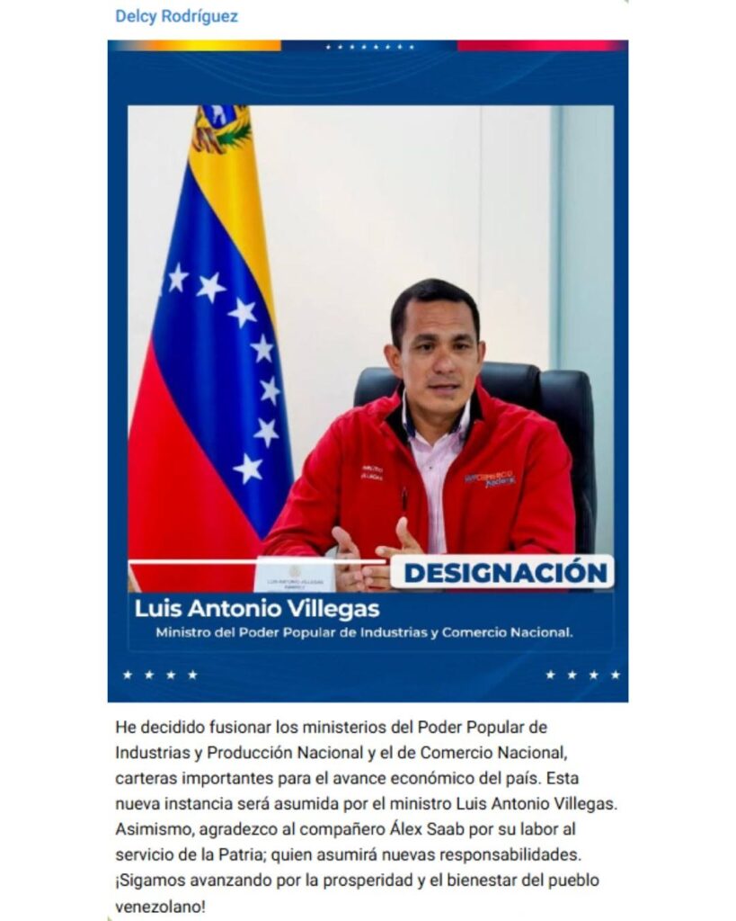 Rodríguez anunció la fusión de los ministerios de Industrias y Producción Nacional y el de Comercio Nacional, que estará a cargo de Luis Antonio Villegas.