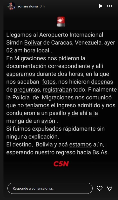 La expulsión se conoció a través de una publicación de Salonia en redes sociales, donde relató que al llegar al país fueron separados del resto de los pasajeros, sometidos a interrogatorios y fotografiados, antes de que se les informara que su ingreso no estaba autorizado.