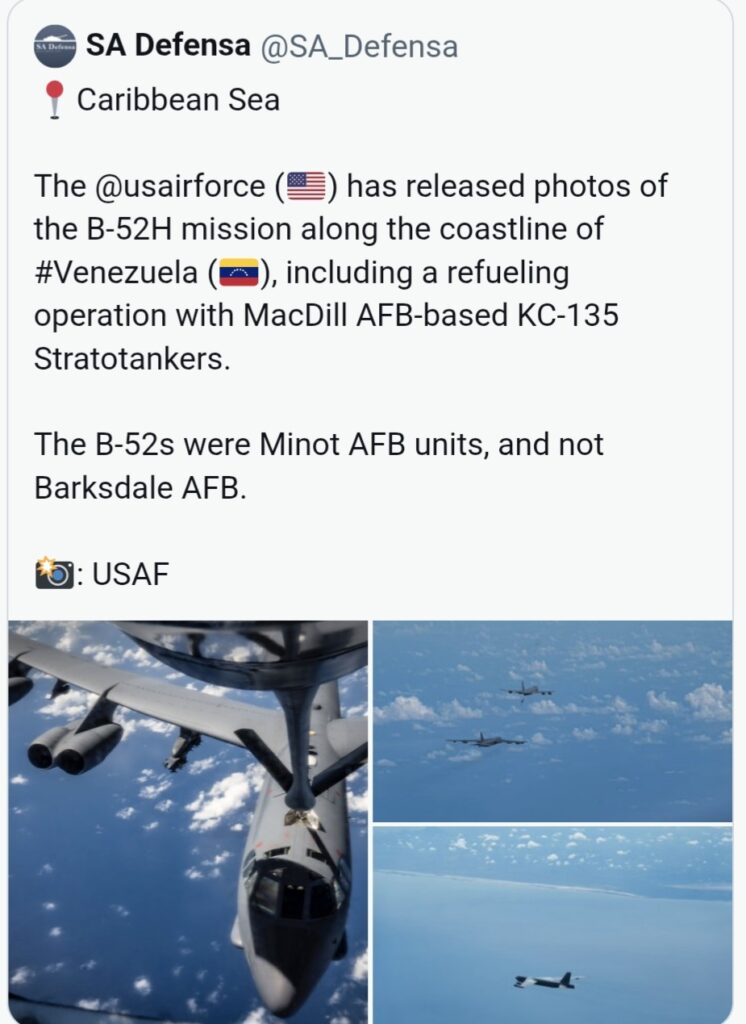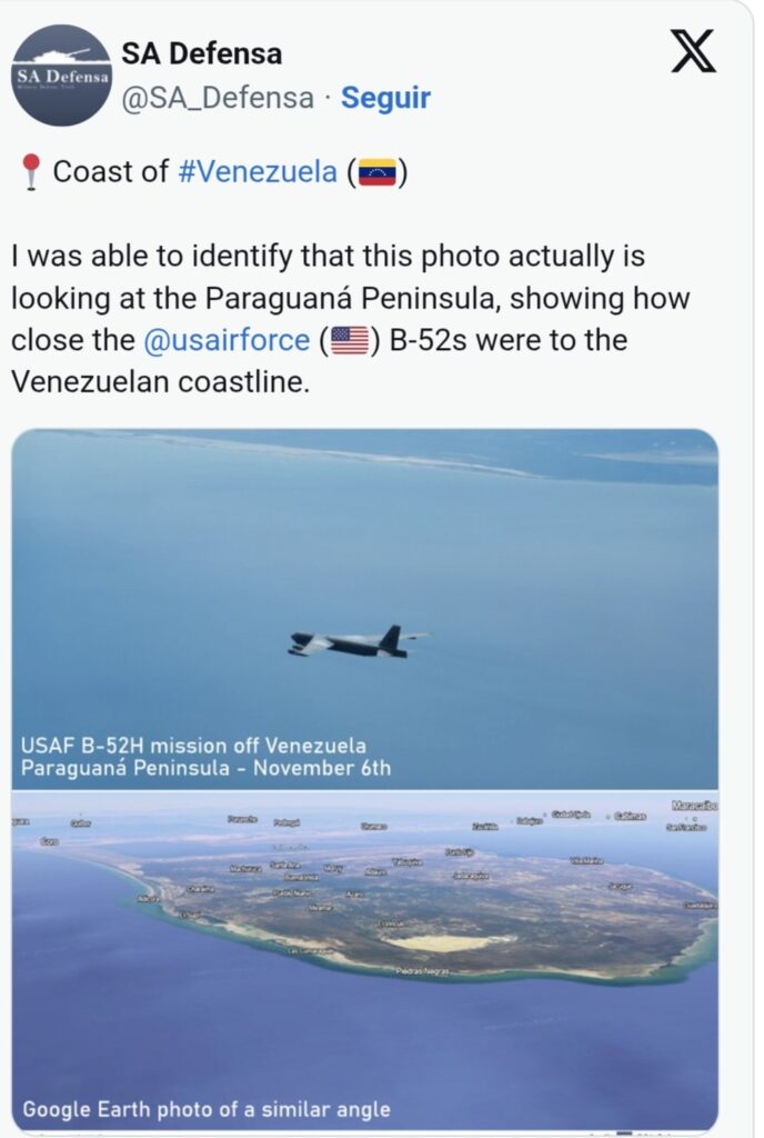 En las fotografías, publicadas en X por el Comando de Ataque Global de la Fuerza Aérea estadounidense, se observa a las aeronaves cerca de las costas venezolanas.