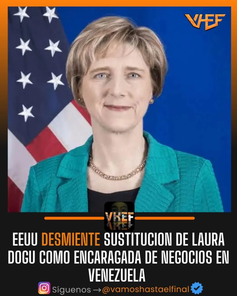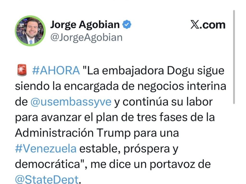 «‘La embajadora Dogu sigue siendo la encargada de negocios interina de la Embajada de Estados Unidos en Venezuela y continúa su labor para avanzar en el plan de tres fases de la administración de Trump para una Venezuela estable, próspera y democrática”, citó el periodista de la respuesta del portavoz.