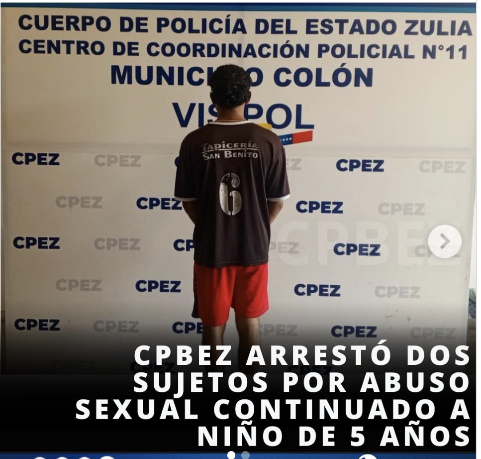 Un niño de cinco años fue víctima de abuso sexual en Santa Bárbara, municipio Colón del estado Zulia, lo que derivó en la detención de su abuela y de un vecino, según informó este domingo en sus redes sociales el Cuerpo de Policía Bolivariana del estado Zulia (Cpbez).
