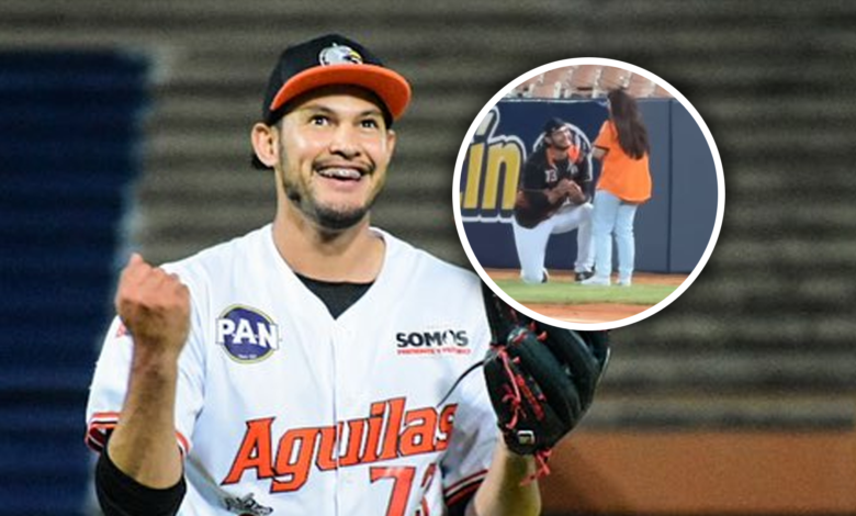 Tras finalizar el encuentro que se saldó con derrota 7-1 ante Navegantes del Magallanes en el nido rapaz, el lanzador derecho se arrodilló cerca de la primera base para proponerle casamiento a su pareja, Paulina Bustamante.