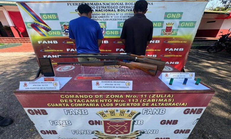 Durante el operativo, destacó Hernández Lárez, fueron aprehendidos Rubén David Cuauro Akles y Juan De Eudes Cuauro Miquelena, quienes se encontraban deambulando armados por la zona. Ambos fueron puestos bajo custodia por porte ilícito de armas de fuego.