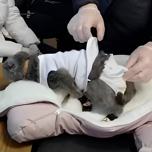 El felino, que también llevaba un sombrero y una bata de bebé, asomó la cabeza por el chaleco para ver de qué se trataba el alboroto antes de que uno de los funcionarios le quitara la gruesa chaqueta.