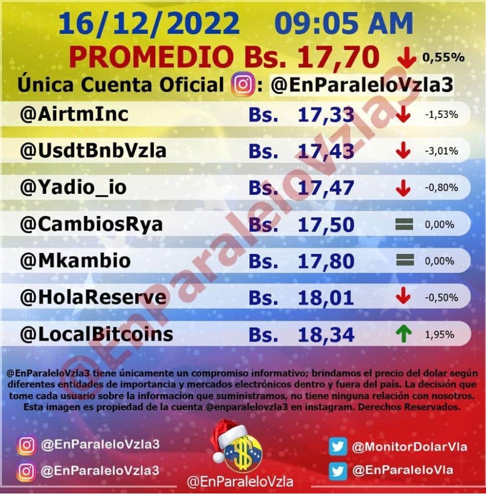 Este viernes, el promedio del dólar paralelo abrió en Bs. 17,70 por unidad, 0,55 % menos en comparación al precio de cierre del jueves