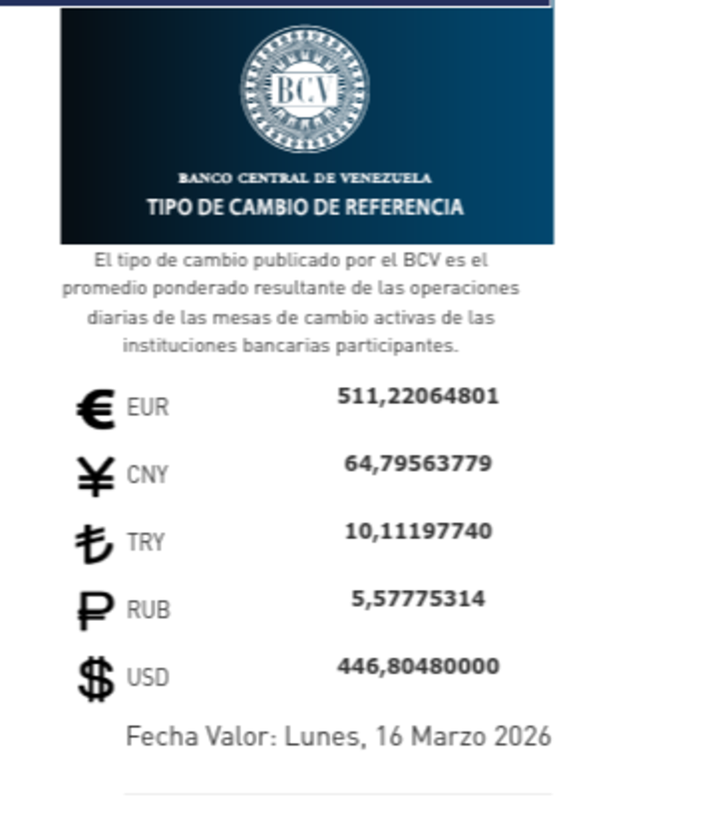 Según la entidad financiera, el tipo de cambio publicado por el BCV es el promedio ponderado de las operaciones de las instituciones bancarias del país, al cierre de la jornada.