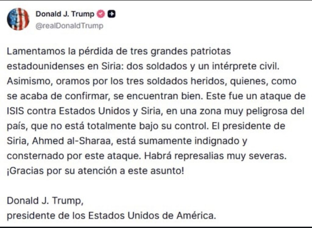 «Vamos a tomar represalias”, afirmó Donald Trump ante periodistas en las afueras de la Casa Blanca este sábado, luego de que dos soldados estadounidenses y un intérprete civil murieran en Siria por un ataque atribuido a un terrorista del Estado Islámico (ISIS). Y luego, a través de un mensaje en su plataforma Truth Social, el mandatario señaló que el presidente sirio Ahmed al Sharaa estaba “sumamente enojado y perturbado” por este incidente.