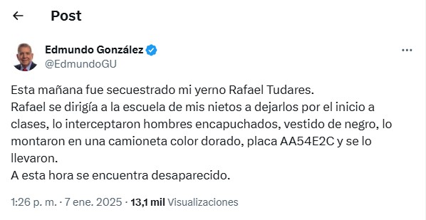 El líder opositor de Venezuela Edmundo González Urrutia, quien se encuentra de gira por América, denunció este martes el secuestro de su yerno Rafael Tudares, en Caracas, cuando llevaba a sus hijos al colegio, por el inicio de las clases.