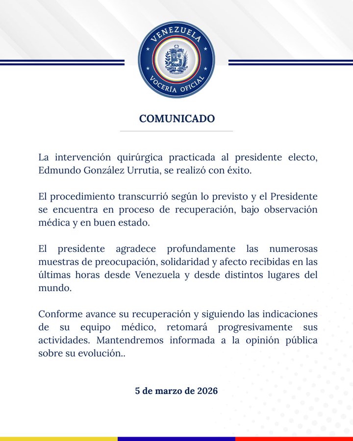 En el comunicado también se indicó que González agradeció las numerosas muestras de apoyo y preocupación recibidas en las últimas horas desde Venezuela y distintos países.