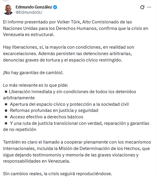 En un mensaje publicado en su cuenta en X, González señaló que el informe refleja que no ha habido liberaciones plenas de presos políticos, y que continúan las detenciones arbitrarias y las denuncias de torturas, como ha documentado el propio alto comisionado.