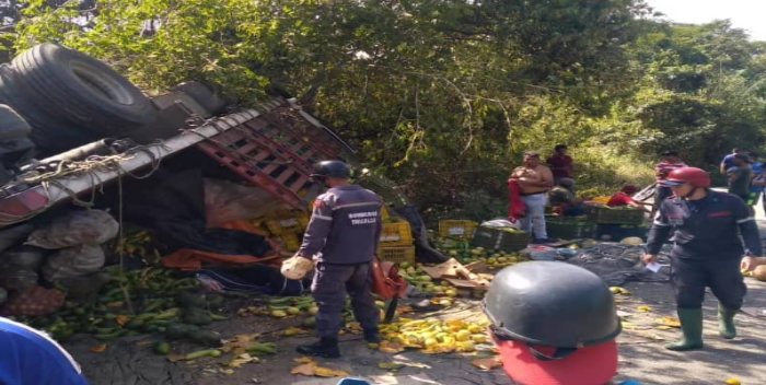 Un camión que transportaba hortalizas y frutas desde el Vigía, en Mérida, con destino a Caracas, se volcó ayer en el sector El Algodonal en el estado Trujillo, dejando dos personas fallecidas y un herido