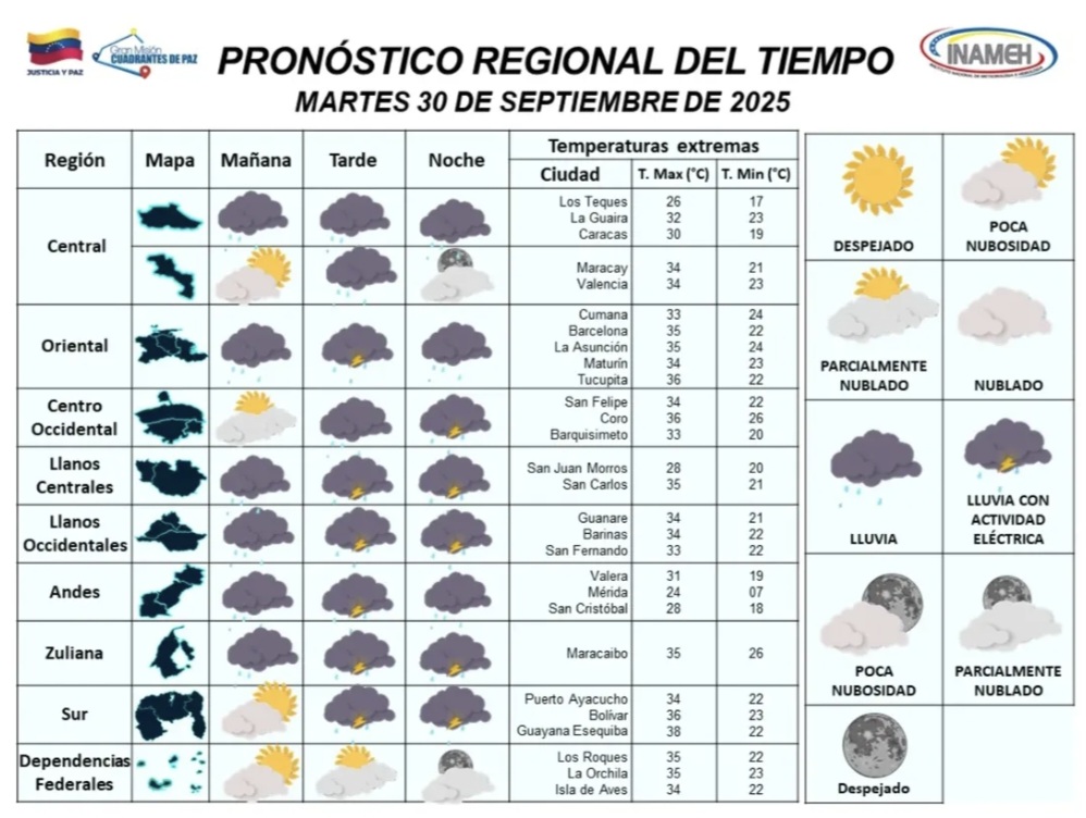 El Instituto Nacional de Meteorología e Hidrología (Inameh) advierte en su pronóstico de este martes 30 de septiembre sobre nubosidad y lluvias en varias regiones de Venezuela.En tal sentido, el Inameh informó que en horas de la mañana habrá nubosidad parcial en gran parte del territorio nacional.