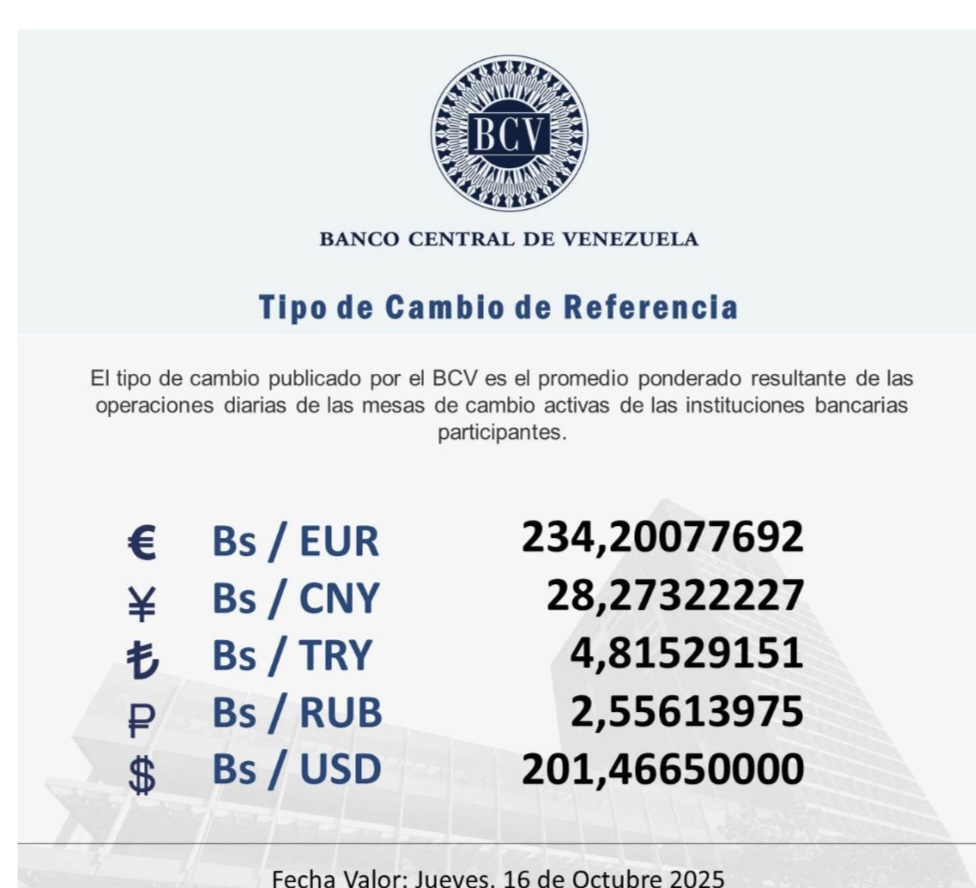 Esta nueva tasa, que es el promedio de las operaciones de las mesas de cambio bancarias, será la que regirá para todas las transacciones económicas del país este jueves 16 de octubre.