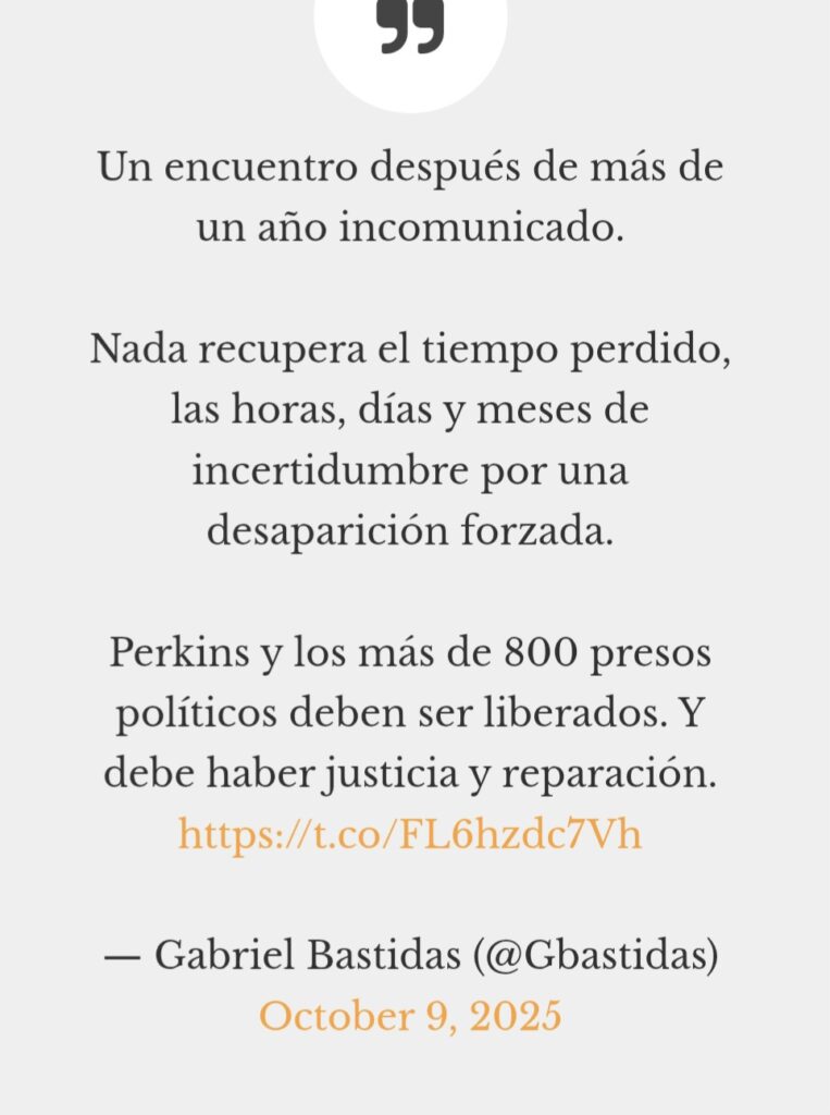 “Conversamos por más de cuatro horas. No fue un ambiente hostil”, indicó Cipriani.El caso de Perkins Rocha vuelve a poner en foco las condiciones de detención en Venezuela y las limitaciones al acceso a derechos básicos como la salud y el contacto familiar.