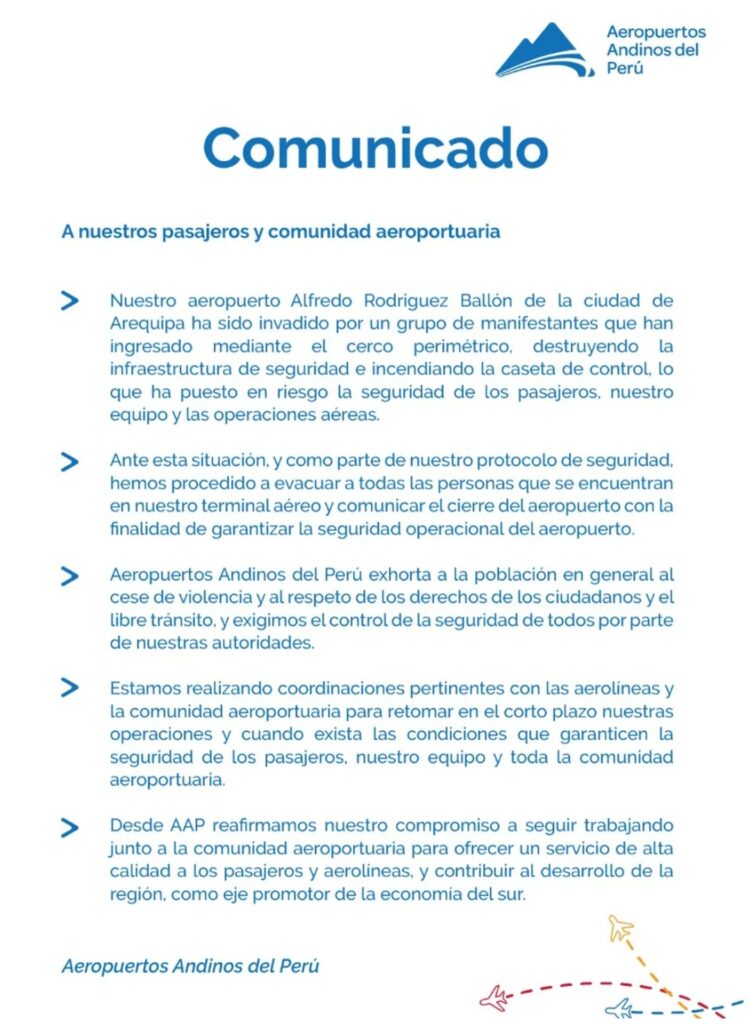 A través de un comunicado, Aeropuertos Andinos del Perú precisó que los manifestantes que ingresaron a las instalaciones del Aeropuerto Internacional Alfredo Rodriguez Ballón destruyeron la infraestructura de seguridad del cerco perimétrico y además incendiaron la caseta de control, poniendo en riesgo a los pasajeros y al equipo del aeropuerto.