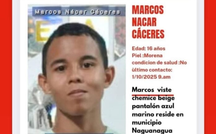 Desde la mañana del pasado miércoles 1 de octubre se encuentra desaparecido el estudiante de quinto año de bachillerato, Marcos Alejandro Nácar Cáceres (16 años), quien reside en Naguanagua, estado Carabobo.