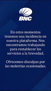 El Banco Nacional de Crédito (BNC) informó este lunes 30 de junio que está presentando una interrupción temporal en sus servicios digitales, lo que afecta el acceso tanto a su plataforma web Bncnet como a la aplicación móvil BNC APP.