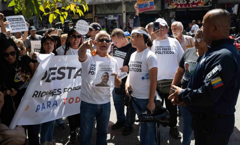 Decenas de familiares y activistas se concentraron con imágenes y carteles con los nombres de sus parientes, banderas de Venezuela y pancartas con mensajes como, “Seguimos esperando la libertad de todos los presos políticos”.