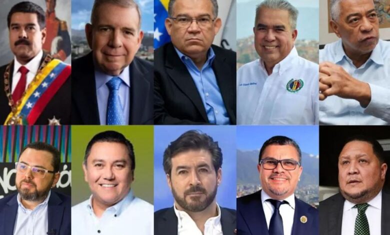 En el tarjetón final se verán reflejados el gobernante Nicolás Maduro (PSUV), quien aspira a una segunda reelección, el diplomático Edmundo González Urrutia (MUD), el pastor evangélico Javier Bertucci (El Cambio), el exrector del CNE Enrique Márquez (Centrados), el rector universitario Luis Eduardo Martínez (AD judicializada), el empresario Benjamín Rausseo (Conde), el profesor universitario Antonio Ecarri (Alianza del Lápiz), los exalcaldes Claudio Fermín (Soluciones) y Daniel Ceballos (Arepa Digital), además del exdiputado José Brito (Primero Venezuela).