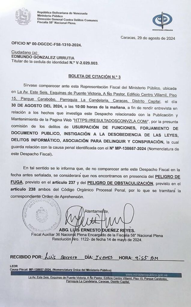 Como lo había previsto el fiscal general de la República, Tarek William Saab, este jueves 29 de agosto el ministerio público emitió la tercera citación al candidato presidencial Edmundo González Urrutia en calidad de investigado por los delitos de usurpación de funciones, forjamiento de documento público, instigación a la desobediencia de las leyes, delitos informáticos, asociación para delinquir y conspiración.