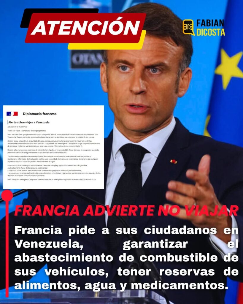 «Todos los viajes a Venezuela deben posponerse.Para los ciudadanos franceses que ya se encuentran en Venezuela: varias aerolíneas han suspendido recientemente sus vuelos a Venezuela. En este contexto, se recomienda consultar el estado de su vuelo con su aerolínea.