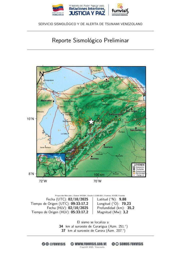 Eran las 4:25 am cuando volvió a temblar en Bachaquero, una magnitud de 2.8, según reportes de Funvisis en su cuenta de X.Una vez más, a las 5:04 am, un sismo se registró en Carora, de 2.9. Después, a las 5:12 am, hubo otro con la misma magnitud.