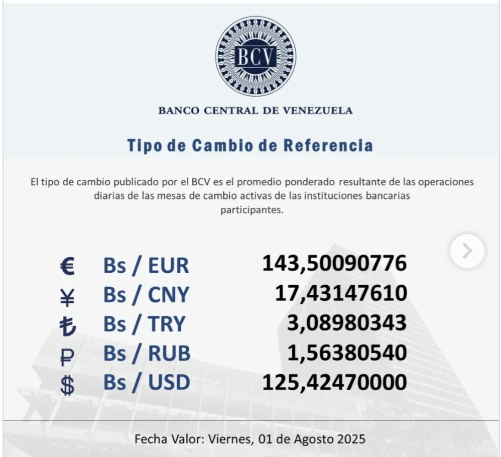 El Banco Central de Venezuela (BCV) reveló el precio de las divisas estadounidenses que circularán este viernes 1° de agosto.