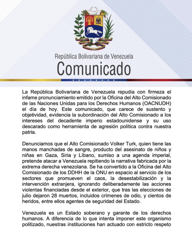En el comunicado, acusan al EE. UU. de usar el Alto Comisionado de la ONU como “herramienta de agresión política” contra Venezuela.“Denunciamos que el Alto Comisionado Volker Turk, quien tiene las manos manchadas de sangre, producto del asesinato de niños y niñas en Gaza, Siria y Líbano, sumiso a una agenda imperial, pretende atacar a Venezuela repitiendo la narrativa fabricada por la extrema derecha venezolana”, reza parte del comunicado.